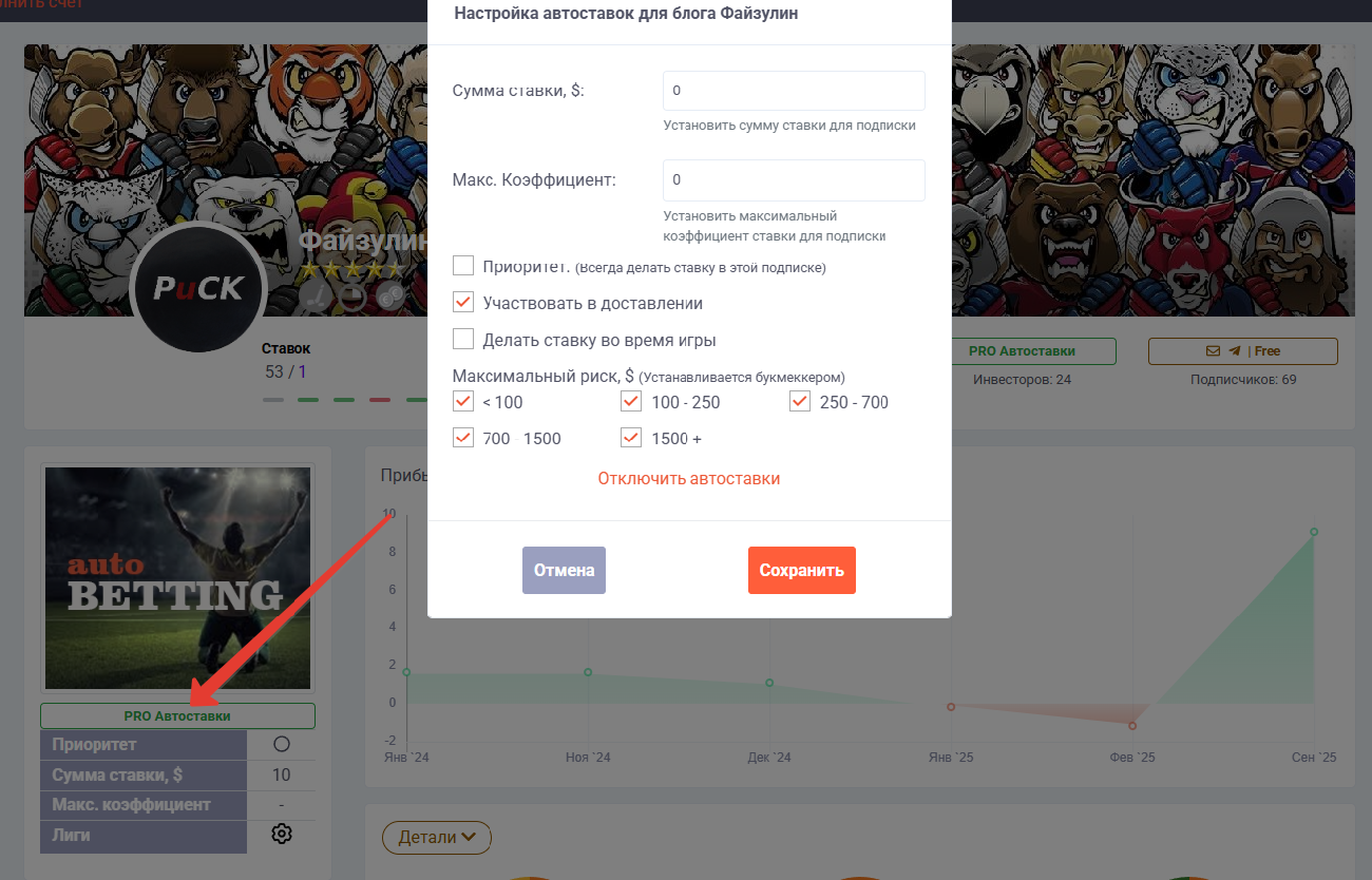 Для отключения подписки или редактирования размера автоставки за отдельным беттером, можно воспользоваться разделом Подписки