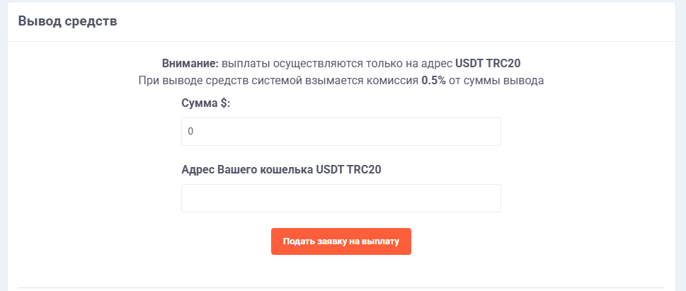 Чтобы заказать деньги на выплату, перейдите в кошелек и укажите сумму для вывода и адрес USDT TRC20 (сеть Tron), нажмите на кнопку "Подать заявку на выплату". После оформления заявки на выплату, на ваш имейл придет письмо, в котором необходимо подтвердить заявку на выплату.